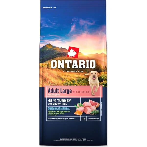 Nourriture Ontario Large Weight Control Dinde & Riz Brun 12kg