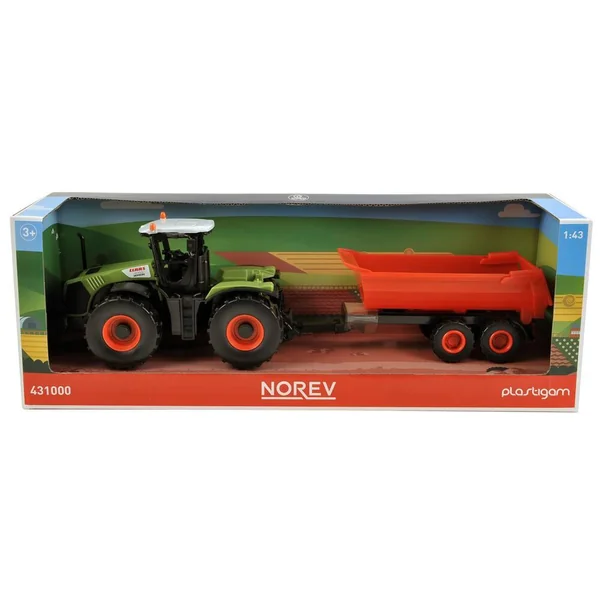 Tracteur Claas Xerion 5000 en plastique à l’echelle 1/43ème livré avec sa remorque fonctionnelle. Longueur du tracteur avec la remorque : 33 cm.