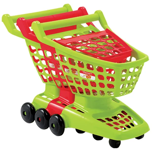 Un chariot de supermarché équipé de 2 roues folles à l’avant et d’une trappe à l’arrière pour l’empiler.