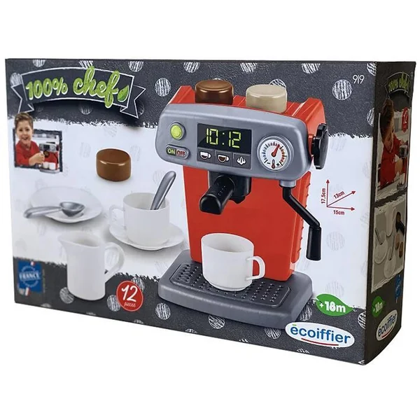 Un percolateur bien équipé avec support à filtre amovible et busette vapeur. 3 dosettes de café moulu sont incluses ainsi que 2 services de tasses et un pot à lait.