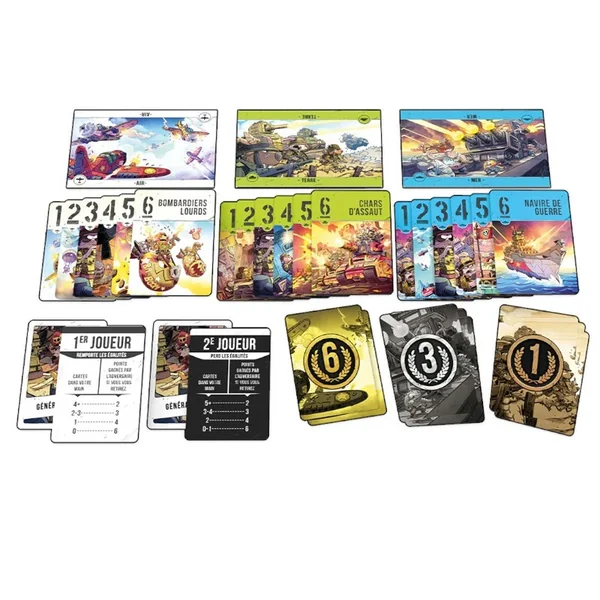 En tant que commandant suprême, vous devez déployer avec soin vos forces sur trois théâtres de guerre possibles : Air, Terre et Mer. L’ordre dans lequel vous jouez vos cartes de bataille est crucial, tout comme la façon dont vous les jouez. Toutes les cartes peuvent être jouées face visible ou face cachée. Jouer une carte face visible déclenche sa capacité tactique, mais la carte doit être jouée dans le théâtre correspondant. Les cartes face cachée sont des cartes sauvages et peuvent être jouées dans n’importe quel théâtre, mais elles n’ont qu’une force de 2 et n’accordent pas de capacités tactiques.