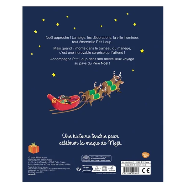 Au marché de Noël, P’tit Loup et Babiloup font un tour de manège quand soudain, leur traîneau s’envole… pour atterrir au pied de la maison du Père Noël !