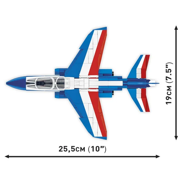 Une fois monté, l’avion mesure 25.5 de long, 19 de large et 10.5 cm de haut. Il est doté d’un support en briques, sur lequel une plaque signalétique portant son nom et le logo de la Patrouille de France est attachée.