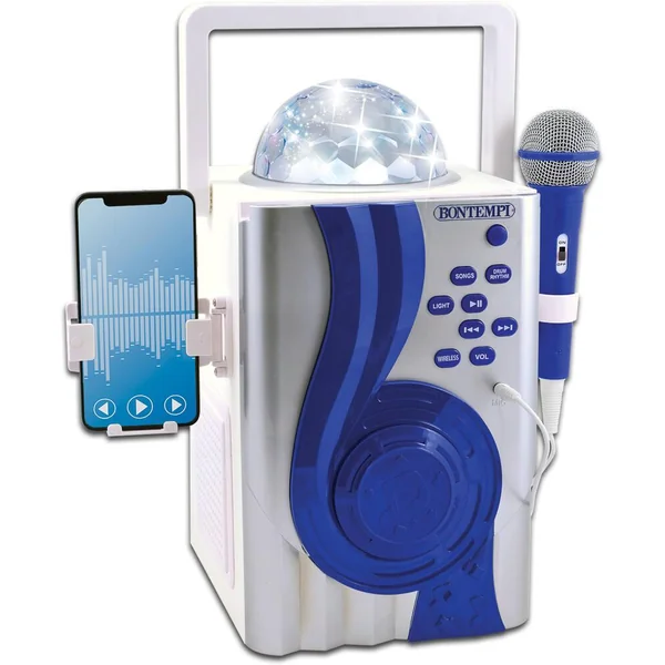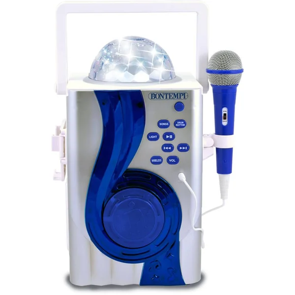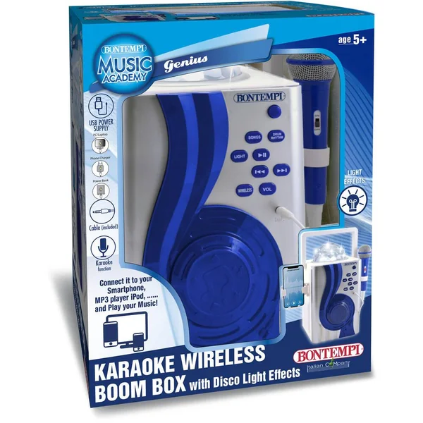 Contient 1 micro avec effet écho et contrôle du volume, 70 démos et 20 rythmes. Connexion sans fil ou par câble jack (fourni) vers une source musicale externe. Alimentation par câble USB/DC (fourni). Effets lumineux.