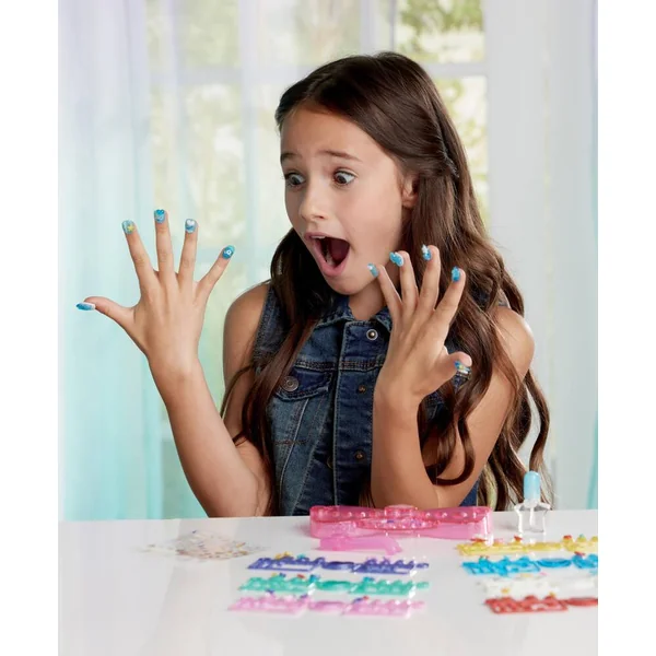 Aquabeads présente la gamme Nail Studio, les ongles qui collent avec de l’eau ! – Réalise une manucure à ton image, en autonomie – Choisis les ongles adaptés à ta taille. Décore les avec des autocollants. Puis, pose dessus des petits accessoires selon ton envie en les faisant adhérer avec de l’eau : ils colleront comme par magie ! Ensuite, pose un petit peu d’eau sur ton ongle, place l’ongle Aquabeads que tu as préparé, fais sécher 3 minutes : la magie opère de nouveau – 1 support manucure, 40 ongles, pince, 1 flacon, des stickers et des décorations fournis. Change ta manucure à l’infini, selon tes envies, et en toute sécurité !