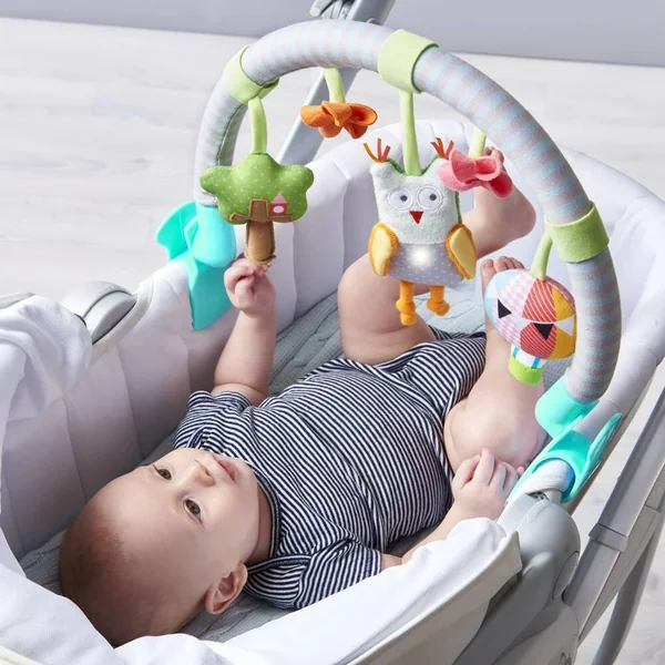 Une arche de poussette colorée avec de nombreuses activités: arbre hochet, ballon hochet et hibou musical et lumineux. L’arche se fixe aisément sur la plupart des poussettes grâce à ses pinces en plastique. Attention ! Afin d’éviter tout risque de blessure suite à un enchevêtrement, ôter le jouet dès que l’enfant tente de se mettre à quatre pattes ou de ramper.
