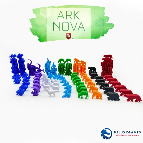 - Meeples animaux (Ark Nova et extension Mondes Marins) : un total de 154 jetons animaux à placer sur leurs tuiles lorsque vous construisez votre parc.