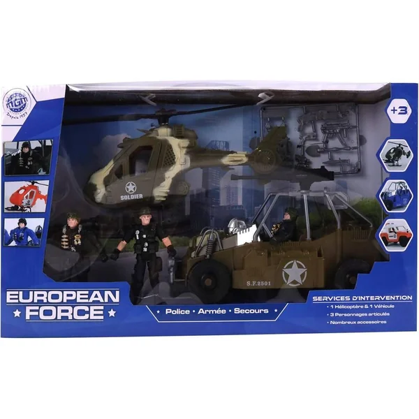 Ce jeu contient 1 coffret avec 1 hélicoptère, 1 véhicule roues libres et 3 personnages articulés.
