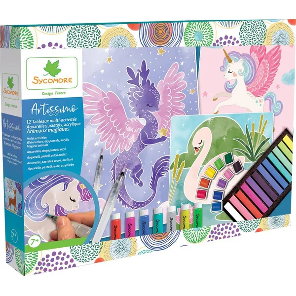 12 tableaux à réaliser, avec des pastels secs , aquarelle et peinture acrylique. Cette belle boîte magnétique contient : 12 tableaux adaptés à chaque technique, 12 pastels secs, 10 godets d’aquarelle, 7 tubes de peinture, 1 pinceau à réservoir, et 1 livret avec modèles et instructions.