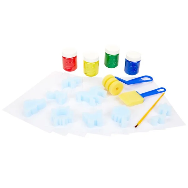 Ce set est un atelier de peinture pour peindre avec les doigts, avec un pinceau ou avec des éponges.