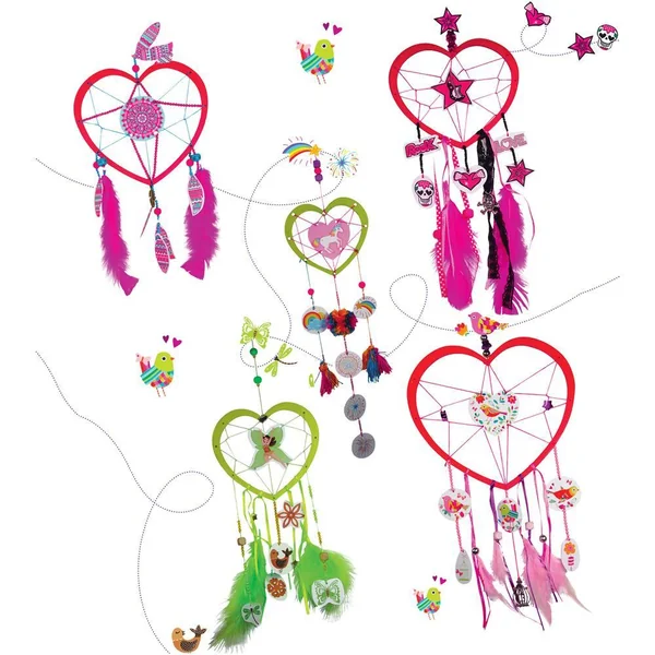 Fabrique 5 attrape-rêves en forme de coeur ! Boîte cadeau livrée avec accessoires, plumes, perles rubans…