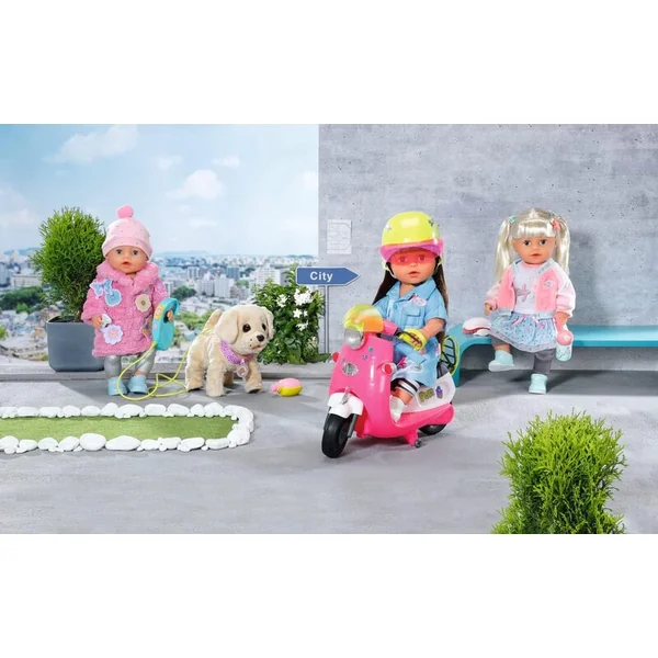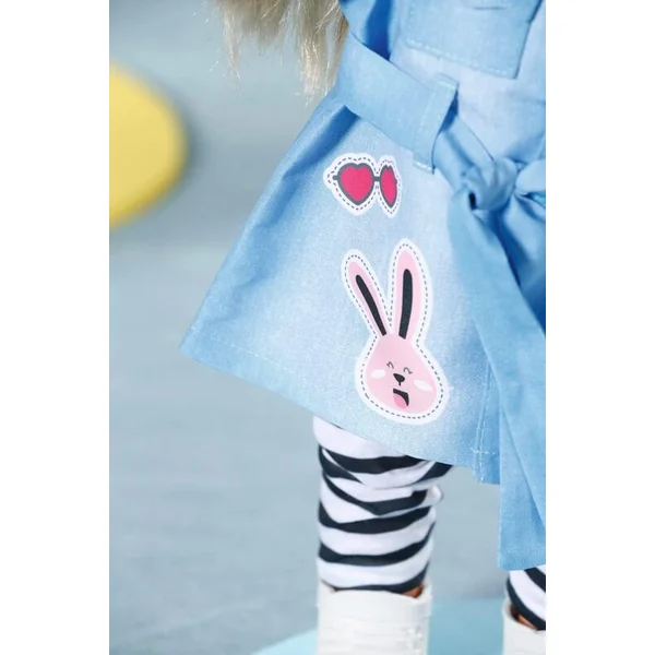 Ce vêtement a l’air d’une chemise décontractée, mais il est aussi élégant qu’un blouse et long comme une robe. Qu’est-ce que cela peut être ? Évidemment – une robe chemise ! Le modèle BABY born au look en jean a des manches retroussées ludiques, un col symétrique, des poches appliquées et une ceinture à nouer. La robe est ornée de jolis motifs qui rappellent des écussons. En dessous, la petite coquette porte des leggings rayés noir et blanc et des baskets blanches. Et sur la tête, elle met un bonnet rose.