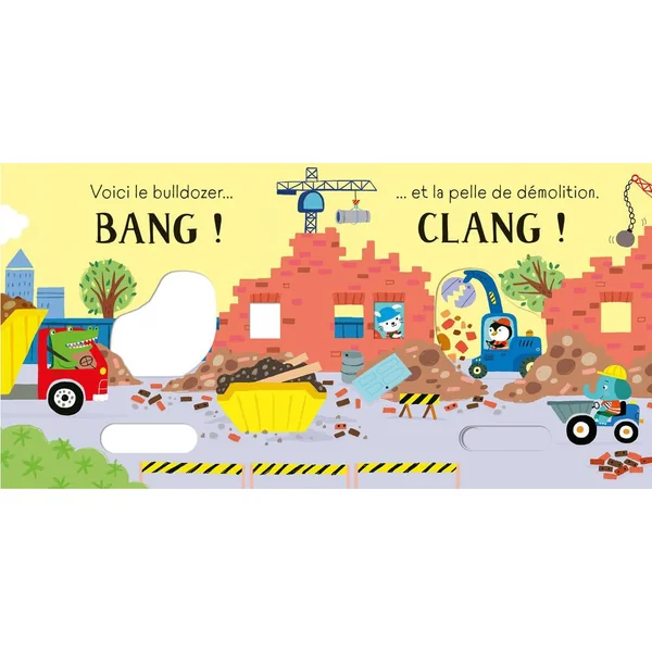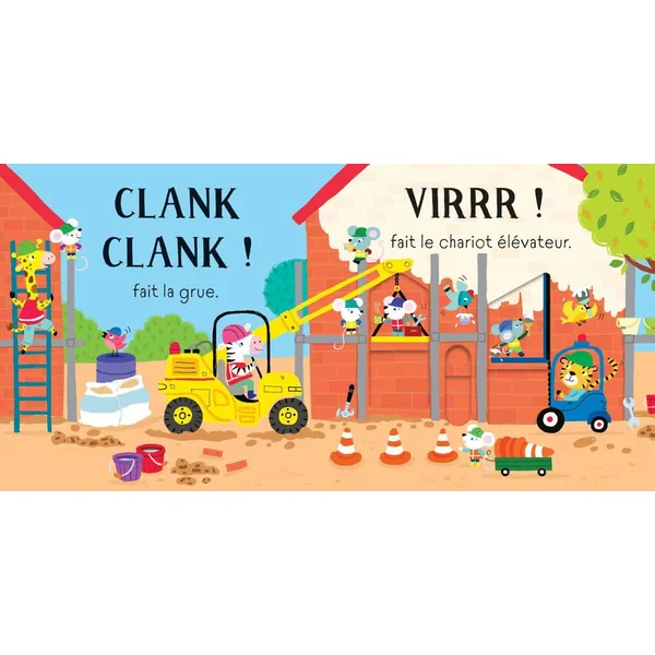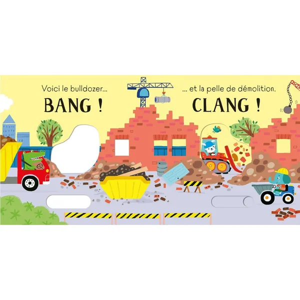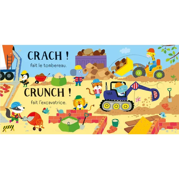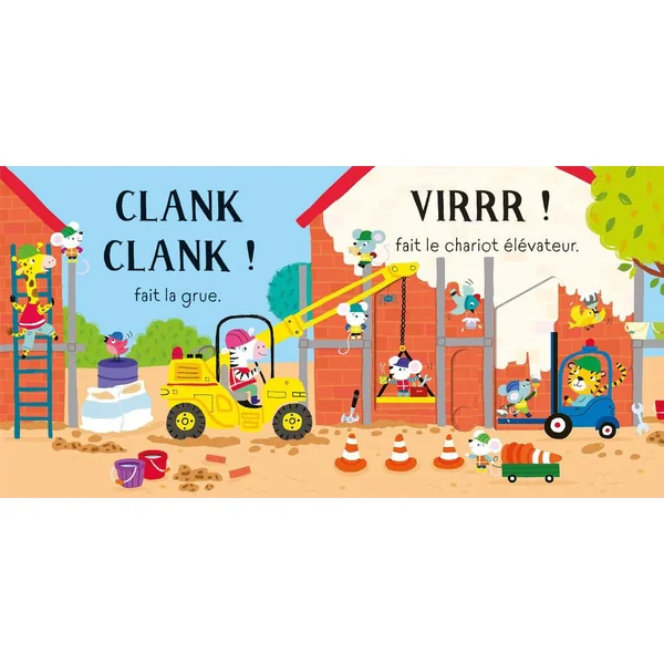 En faisant glisser les tirettes de ce livre sonore dans un sens puis dans l’autre, les tout-petits verront et entendront un chantier s’animer. Au fil des illustrations pleines de charmes, des pelleteuses, des grues, des chariots élévateurs et des rouleaux compresseurs se mettent en marche grâce à chaque tirette qui permet d’écouter les bruits de deux engins différents dès 6 mois.