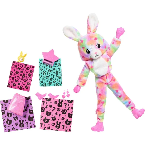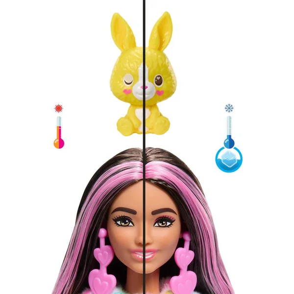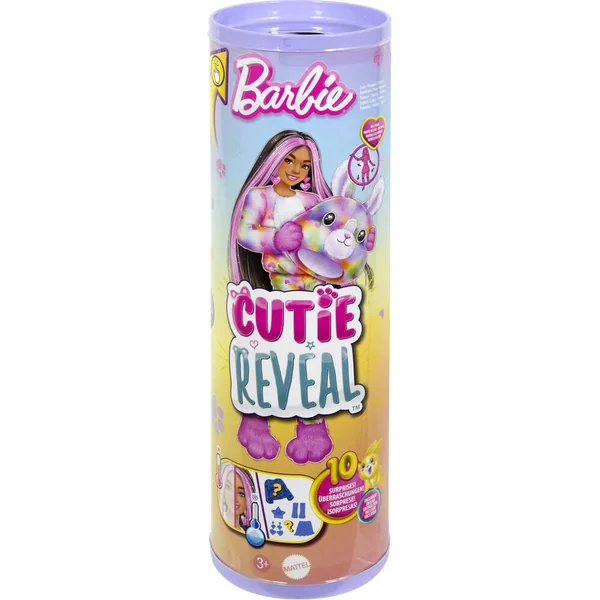 Contient 1 poupée Barbie Cutie Reveal Rêve Coloré avec costume (composé de 5 pièces), 1 mini-animal de compagnie, 1 peigne, 1 paire de boucles d’oreilles, 1 paire de chaussures et 1 jupe. La poupée ne tient pas debout toute seule. Avec 10 surprises dans un même coffret, les poupées Barbie Cutie Reveal de la série Rêve Coloré font de la découverte du jouet une expérience adorable. Chaque coffret comprend des amis en peluche, des habillages et des éléments amusants qui se transforment ! Ouvrez le coffret pour découvrir un adorable costume de lapin en peluche noir et blanc qui se transforme en un look coloré plein de fantaisie avec un imprimé cœur à l’effet tie-dye tellement mignon ! Soulevez la tête du costume pour dévoiler une poupée Barbie aux longs cheveux noirs méchés de rose, avec des points d’articulation et des détails étincelants sur le visage ! Ouvrez les 4 sachets surprises, qui contiennent des habillages et des accessoires comme une jupe, une paire de chaussures, des boucles d’oreilles, un peigne et un adorable mini-animal assorti ! Les enfants peuvent habiller et accessoiriser la poupée Barbie en retournant le haut du costume qui se transforme en veste polaire toute douce à imprimé tendance. La tête du costume devient, quant à elle, un petit lit pour le mini-animal ! Utilisez de l’eau glacée et de l’eau chaude pour transformer le visage de Barbie avec des détails étincelants, ainsi que pour « ouvrir » et « fermer » les yeux du mini-animal de compagnie. Une opération à répéter à l’infini ! Les poupées Barbie Cutie Reveal de la série Rêve Coloré sont le cadeau idéal pour les enfants de 3 à 7 ans, en particulier ceux qui aiment découvrir d’adorables surprises !