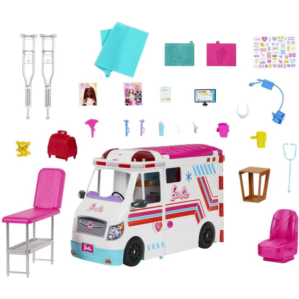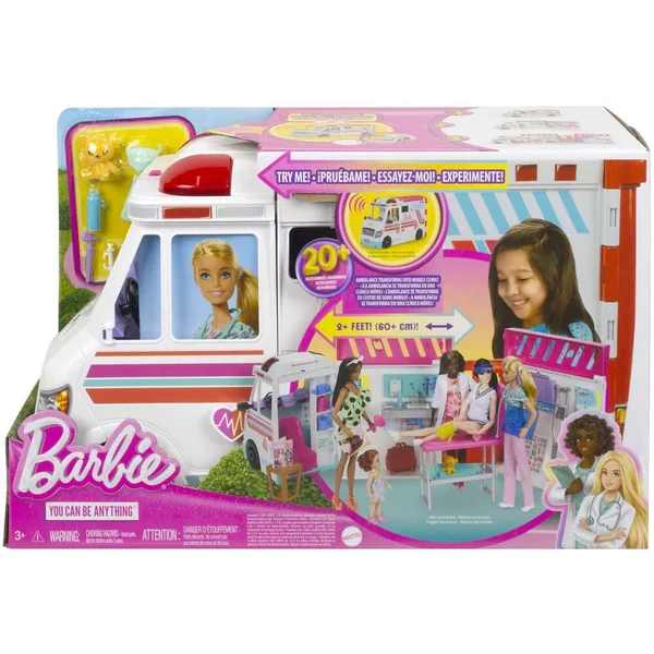 Cette ambulance avec ses sirènes sonores et lumineuses se transforme en clinique. 4 espaces de jeu et plus de 20 accessoires sont intégrés au véhicule. Poupée non incluse.
