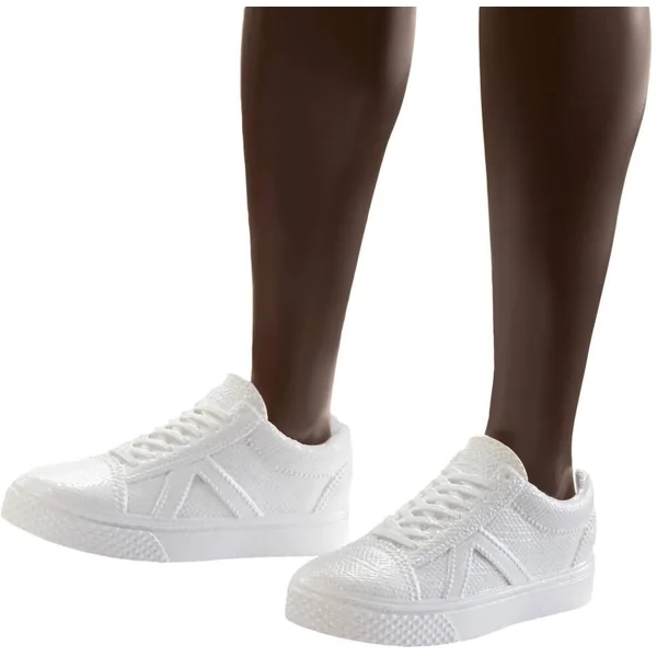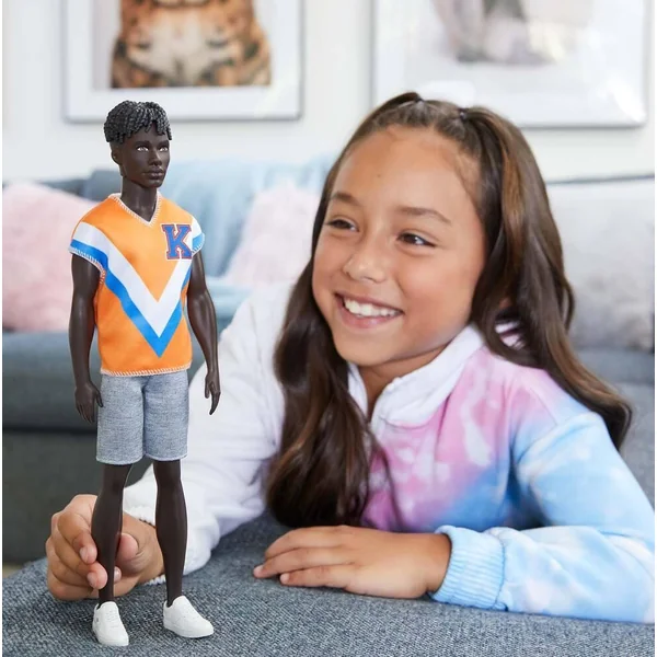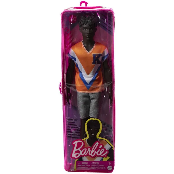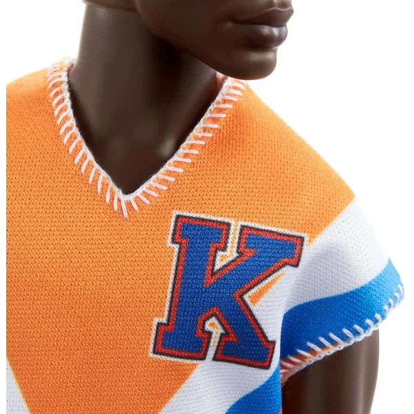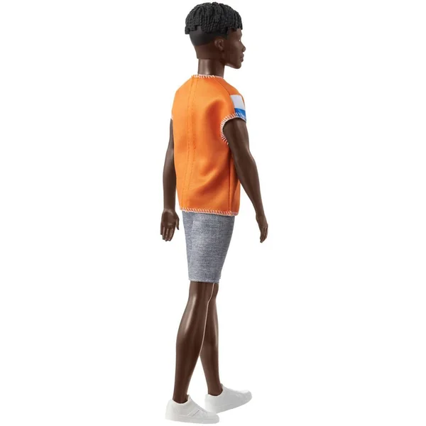 Ken porte une tenue décontractée, un bermuda gris et un t-shirt orange. La poupée est chaussée de tennis blanches aux pieds.