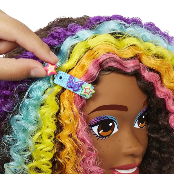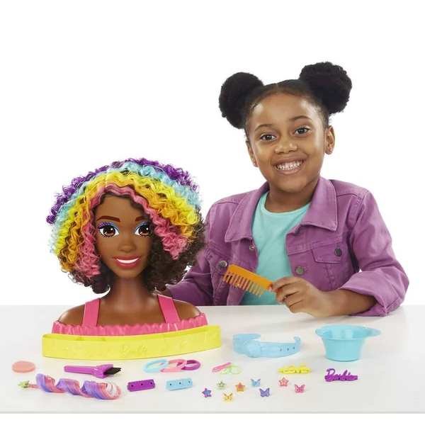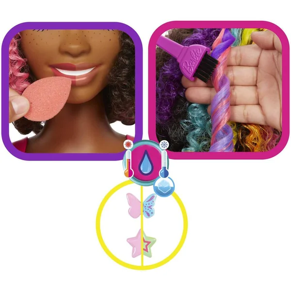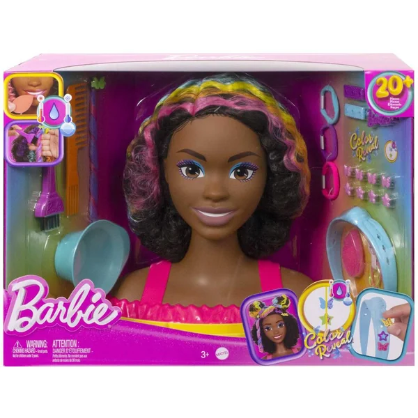 Inclut : 1 tête à coiffer Barbie® avec base à compartiments, 1 peigne à dents larges, 1 pinceau de coloration, 1 bol de coloration, 1 éponge de maquillage, 4 barrettes personnalisables, 8 décorations Color Reveal à fixer, 1 extension capillaire qui change de couleur, 1 serre-tête personnalisable et 6 élastiques.