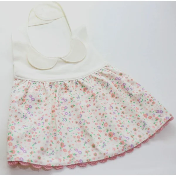 Bavoir en forme de petite robe pour petite princesse – Dessins de fleurs de coton qui voltigent à travers le vent, redessinés par Lucie B. illustratrice de genie. Les details de broderie rose et la douceur du coton font de ce bavoir évolutif (reglable au niveau du cou en fonction de la taille de l’enfant), une valse à mi chemin entre le pret à porter et le vêtement de protection pour bébé.