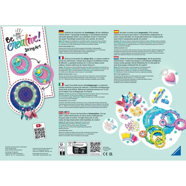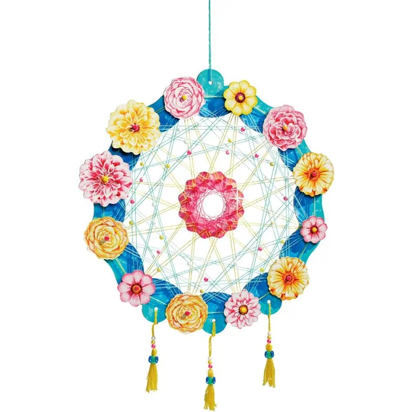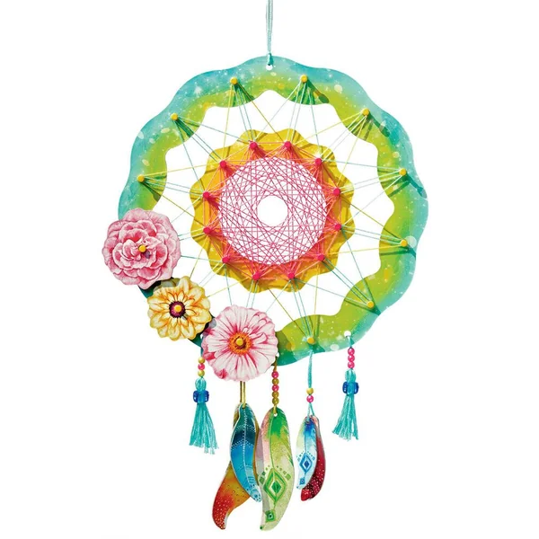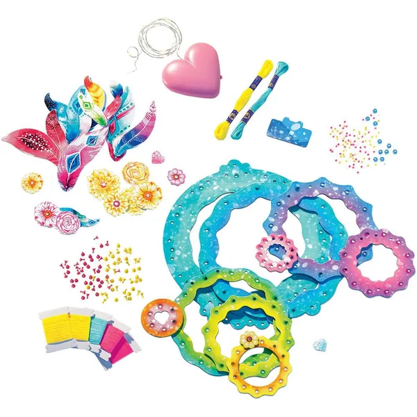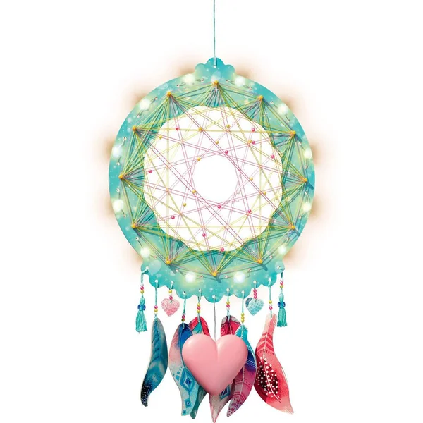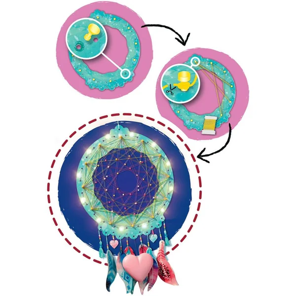 Ce coffret complet permet de réaliser jusqu’à 7 attrape-rêves de différentes tailles qui sauront protéger les enfants des cauchemars et décorer une chambre à merveille ! Son plus ? La guirlande lumineuse, qui se met en veille au bout de 15 minutes, équipée de 12 LEDs avec un interrupteur en forme de cœur ! Après le montage, entrelace les fils dans le sens que tu souhaites. Libre à toi de choisir la couleur des fils pour exprimer ta sensibilité artistique ! Contenu : 9 anneaux en carton de différentes tailles, plumes et fleurs pré-découpées, 210 épingles en plastique, 125 m de fil à broder, 1 outil pour pompons plats, 16 m de fil pour pompons, 160 perles, 1 guirlande lumineuse avec 12 LEDs avec 1 boitier à piles en forme de cœur et 1 instruction détaillée. Ce produit est composé de matériaux issus de forêts bien gérées certifiées FSC®, de matériaux recyclés et de matériaux issus d’autres sources contrôlées (FSC-C111262). Nécessite 1 pile AA LR6 non fournie.