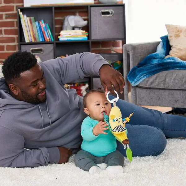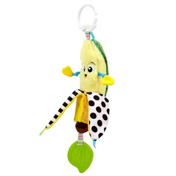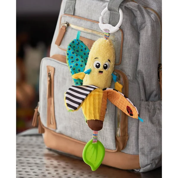 Jouez à coucou-caché avec Bébé en épluchant la banane. Bébé découvre de multiples activités : Des sons surprises, des textures différentes, des motifs très contrastés dont des contrastes Noirs & Blancs, rubans en satin, bruits de papier-froissé et une feuille de dentition à mordiller. Stimule la vision et l’audition et aide à développer la motricité fine. S’accroche partout grâce à son clip ! De 0 à 24 mois.