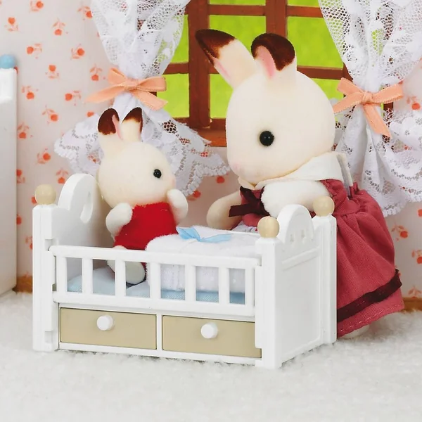 Un des indispensables de la maison des Sylvanian : le lit de bébé. Pratique, la barrière est amovible et il est muni de 2 tiroirs qui s’ouvrent et se ferment à loisir. Inclus: 1 figurine bébé lapin chocolat, 1 lit à barreaux avec deux tiroirs.