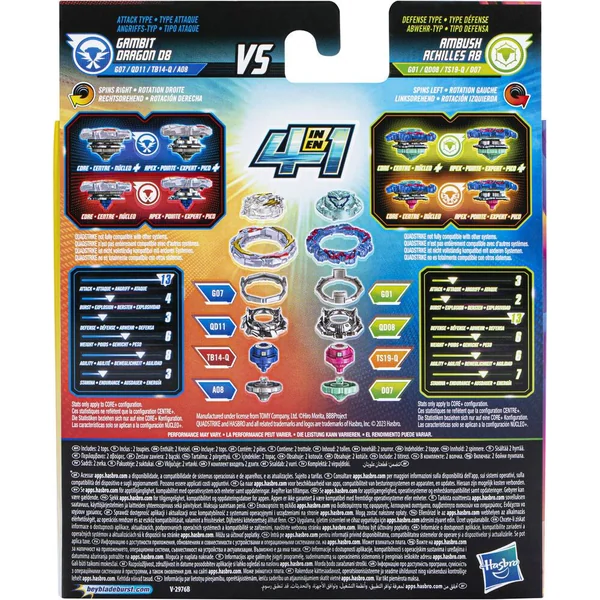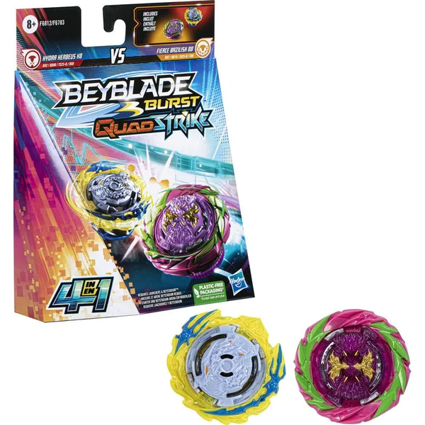 VERS LA VICTOIRE : Les enfants tentent de trouver la meilleure configuration pour s’affronter dans l’arène QuadStrike Beystadium (arène Beystadium et lanceurs vendus séparément, dans la limite des stocks)COMBATS NUMÉRIQUES : On peut scanner le code sur la toupie QuadStrike pour faire passer le combat à un autre niveau ! On peut alors utiliser cette toupie dans l’appli Beyblade Burst pour affronter des Bladers du monde entier !HYPERVITESSE : On peut se lancer dans des combats en duel avec les arènes Beyblade Burst Beystadium, les lanceurs et les toupies (vendus séparément, dans la limite des stocks) tout en cheminant comme Blader.