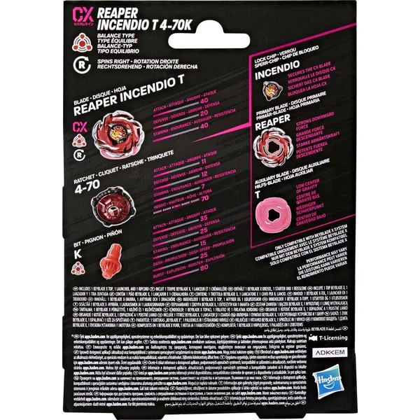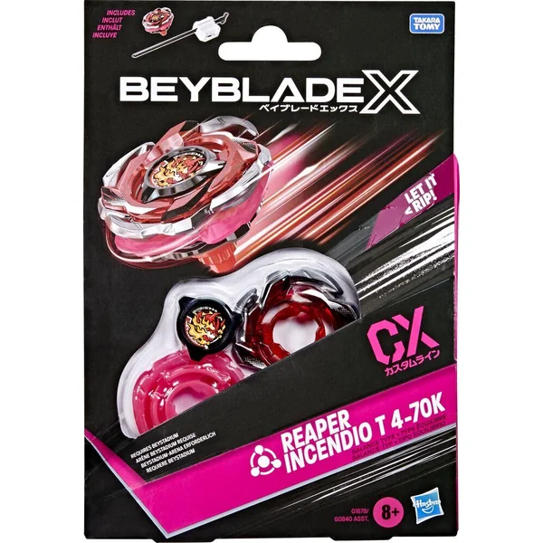 On peut vivre toute l’action de Beyblade X, la prochaine génération d’arènes, de lanceurs et de toupies Beyblade. Le Starter Pack Beyblade X Reaper Incendio T 4-70K CX inclut un lanceur et une toupie à rotation droite de type équilibre avec un disque de type équilibre (arène Beystadium et lanceur requis, vendus séparément). On peut se lancer directement dans la compétition ou reconfigurer la toupie en interchangeant ses pièces avec celles d’autres toupies Beyblade X (vendues séparément) pour créer sa propre toupie imbattable. Les toupies CX sont conçues avec un disque qui se sépare en 3 pièces pour plus d’options de personnalisation. Beyblade X utilise le système d’Accélération X. Quand les dents du pignon d’une toupie Beyblade X rencontrent celles du rail d’Accélération X de l’arène Beystadium, elle reçoit une super-accélération qui la propulse à toute vitesse dans l’arène pour des impacts écrasants et des explosions spectaculaires. On lance ses toupies dans des compétitions intenses contre ses adversaires pour marquer des points à chaque affrontement. Les toupies Hasbro Beyblade avec pièces en métal moulé Takara Tomy authentiques sont de super cadeaux pour enfants, à partir de 8 ans. HASBRO et tous les logos et marques associés sont des marques de commerce de Hasbro, Inc.