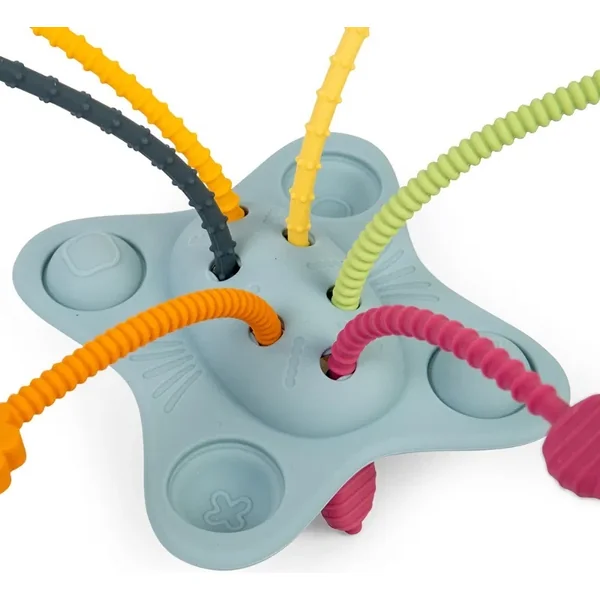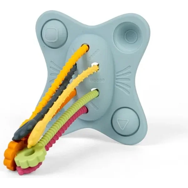 Caractéristiques principales : 6 cordons, 4 boutons, développe la perception sensorielle et la motricité fine, fabriqué en silicone alimentaire non toxique, entretien facile, adapté dès 10 mois.