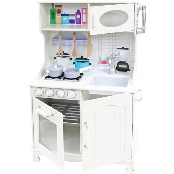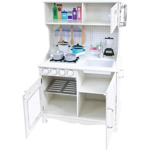 Cuisine pour enfants de style méditerranéen ravira tous les petits chefs et cheffes. Elle est équipée d’un évier, d’une cuisinière, d’un four et d’un micro-ondes, offrant ainsi aux enfants de nombreuses possibilités de jeu créatif. Les boutons rotatifs sur la cuisinière ajoutent de l’authenticité au jeu et permettent une cuisine réaliste. Des espaces de rangement pratiques au-dessus du plan de travail et sous l’évier offrent de la place pour la vaisselle et les ustensiles de cuisine. Sur le côté se trouve un téléphone qui complète l’expérience de jeu globale. La cuisine est robuste, stable et fabriquée en contreplaqué solide et en bois massif, garantissant une longue durée de vie.