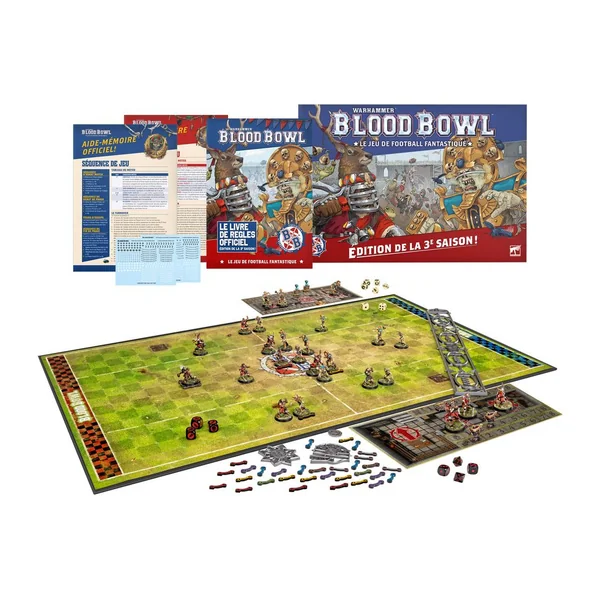 - 1x exemplaire de Blood Bowl: Le Livre de Règles Officiel – Édition de la 3e Saison, un livre relié de 200 pages qui explique les règles du jeu, comment organiser une Ligue et développer votre équipe, et qui contient les Fiches d’Équipe et les profils de joueurs
