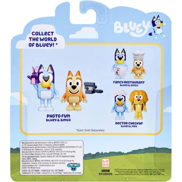 Bluey est une chienne de 6 ans qui vit les meilleures aventures avec sa famille. Bluey a un appareil photo super deluxe et Bingo un accessoire pour faire sourire tout le monde ! Cliquez… vous y êtes ! Bluey sait exactement comment prendre la photo parfaite. Les enfants adoreront recréer les aventures de Bluey de l’émission télévisée Bluey ou créer de nouvelles aventures avec ce jouet amusant !