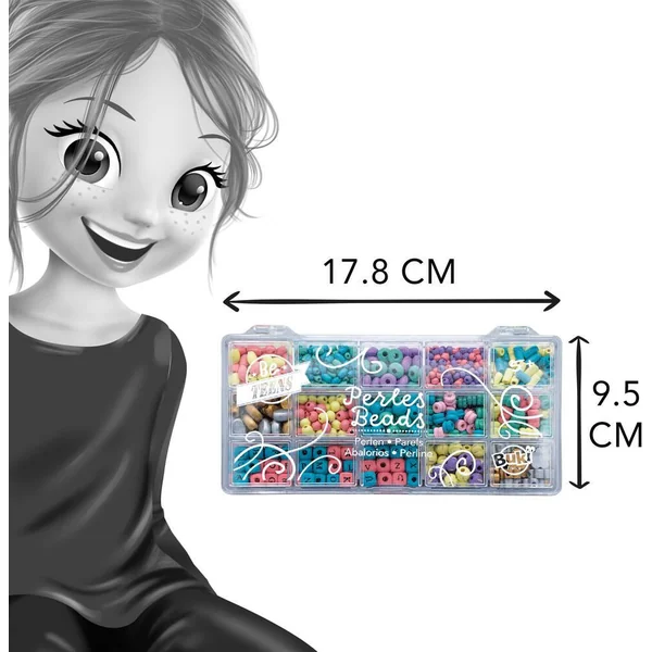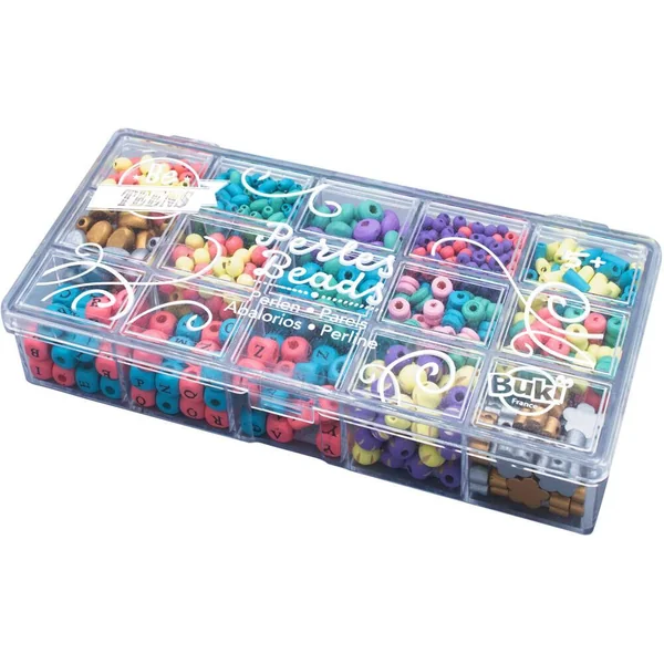 Une boîte avec 13 styles différents de perles en bois ! Des perles aux couleurs pastel, des perles dorées, argentées mais également des lettres. Choisis les perles et mixe les styles et couleurs pour créer de jolis bijoux tendance ! La boîte de rangement te permettra de ne pas mélanger les perles ! La boîte contient 90g de perles.