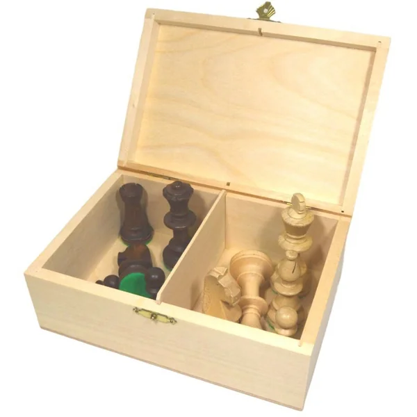 La boîte en bois pour grandes pièces d’échecs est fabriquée avec soin et présente une finition de qualité. La boîte se ferme solidement avec son fermoir.