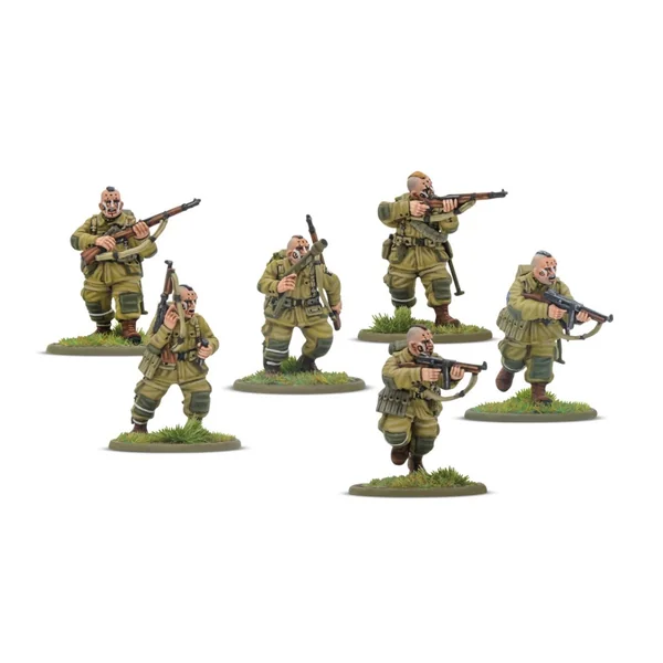 Le peloton de fusiliers est soutenu par deux formations plus petites déployant de puissantes armes de soutien – un peloton d’armes lourdes composé de deux équipes de mitrailleuses moyennes et d’une équipe de mortiers moyens, plus un chef de peloton, tous en résine Warlord, et un peloton d’artillerie avec deux canons métalliques : un obusier de 75 mm pour les tirs indirects et un canon antichar de 57 mm pour s’attaquer aux blindés ennemis. Ces unités sont dirigées par un commandant de peloton construit à partir de figurines en plastique.