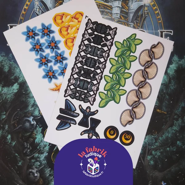 - Stickers recto/verso pour le 5e Personnage (Gardienne, Navire, Novice et marqueur Score) + les Ressources supplémentaires