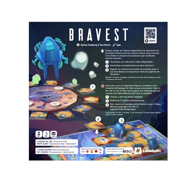 Chaque Brave suivra son propre chemin et marquera des points en fonction de ce qu’il croisera : l’Invincible doit affronter des créatures étranges pendant que l’Agile doit braver des lieux hostiles. Lorsque tout votre plateau est recouvert de tuiles, lancez vos braves sur leurs parcours et comptez vos points facilement à l’aide de la piste de scores.
