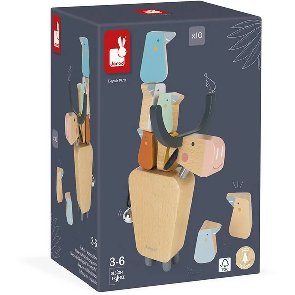 Jeu d’équilibre composé d’un buffle en bois massif et de 10 oiseaux (5 grands et 5 petits). Pour un joueur et plus : Il faut réussir la plus haute pyramide d’oiseaux sur le dos du buffle sans les faire tomber. A plusieurs, celui qui pose l’oiseau de trop, a perdu !! Développe la patience et la dextérité. Pour enfants de 3 à 6 ans. Jouet en bois.