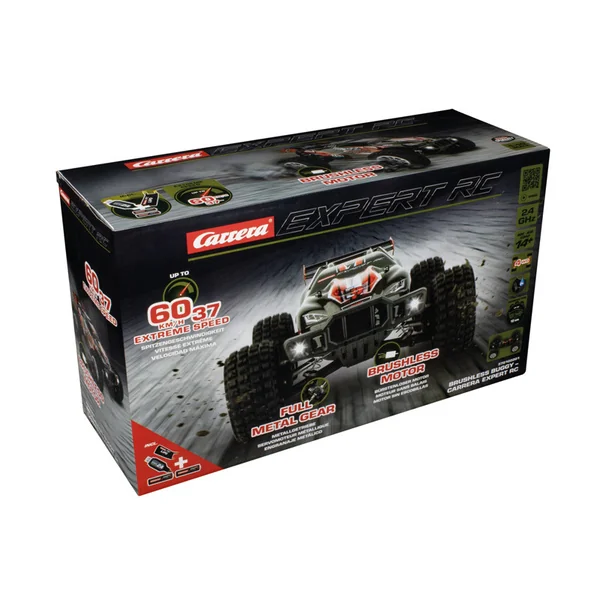 Avec la ligne Carrera Expert RC, tous les pilotes RC amateurs et professionnels prennent leur envol. Le Carrera Expert RC Brushless Buggy convainc par un équipement technique de haute qualité, une vitesse de pointe jusqu’à 60 km/h et la possibilité pour les bricoleurs de visser sous le capot.