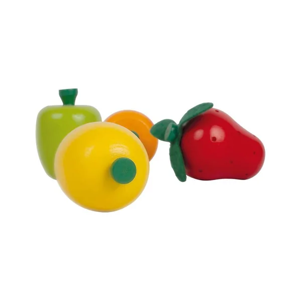 Cagette en bois (contreplaqué) avec 12 fruits également en bois (merisier) : 2 fraises, 2 citrons, 2 pommes vertes, 2 paires de cerises, 2 bananes et 2 oranges. Peinture standard.