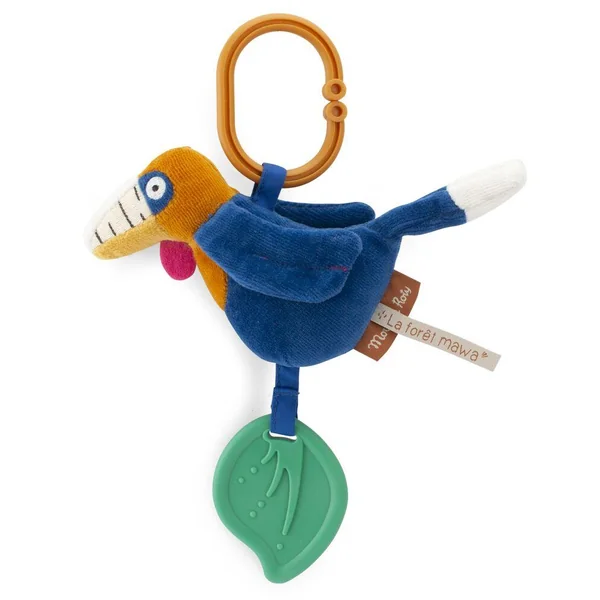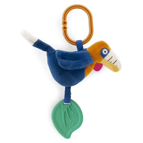 Calao coloré à suspendre avec une clochette dans son ventre et des ailes qui font scritchent. Il porte également un jouet de dentition en forme de feuilles.