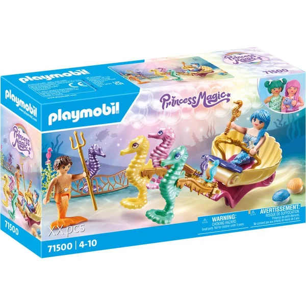 Plongez dans le monde magique de Princess Magic avec le coffret unique PLAYMOBIL, Calèche avec sirènes et hippocampes. Avec les hippocampes, les sirènes explorent l’océan dans leur calèche scintillante.