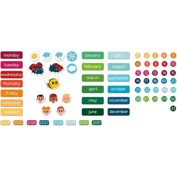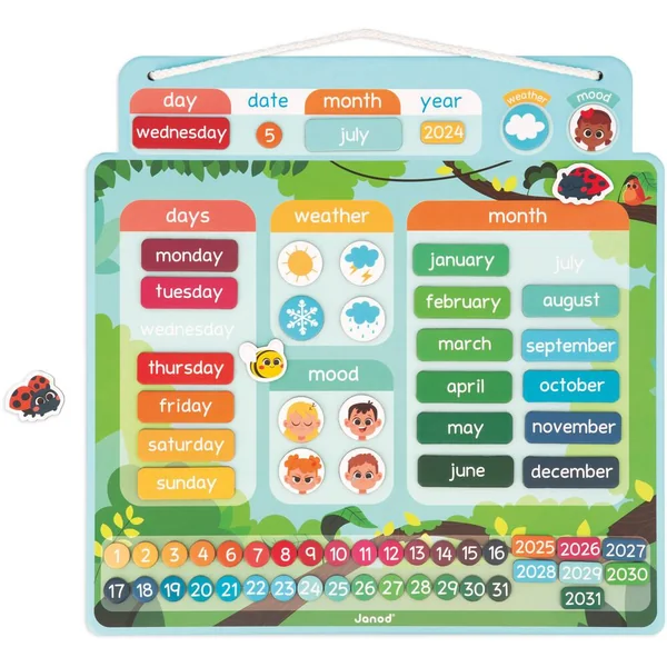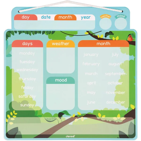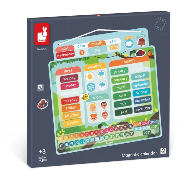 Une nouvelle journée commence, quel jour sommes-nous ? Quel temps fait-il ? Chaque jour, votre enfant prendra plaisir à renseigner le jour, la date, le mois, la météo et son humeur avec ce calendrier magnétique aux couleurs joyeuses. Le calendrier se compose d’un tableau à suspendre et de 68 magnets pour indiquer la date (jour-mois-année) et 3 magnets en forme d’animaux pour s’amuser sur le plateau ! Ce jouet ludique et éducatif est idéal pour que votre enfant apprenne à se repérer dans le temps. Jouet magnétique en carton FSCTMpour les enfants à partir de 3ans.