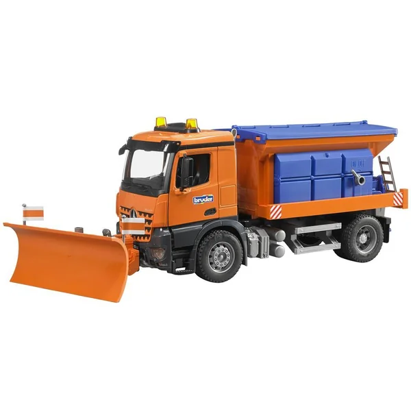 Echelle 1/16ème. Camion chasse-neige Mercedes Benz modèle Arocs avec lame frontale. Les portes de la cabine s’ouvrent et le rétroviseur extérieur est rabattable. Les portes du réservoir à l’arrière s’ouvrent. Le réservoir peut être rempli de sable ou d’eau. La vis sans fin du réservoir est actionnée par une manette, position on et off située sur le côté du camion permettant de faire couler le sable par exemple. La lame frontale est amovible. En plastique. Compatible avec la souffleuse à neige (référence 2349), vendu séparément.