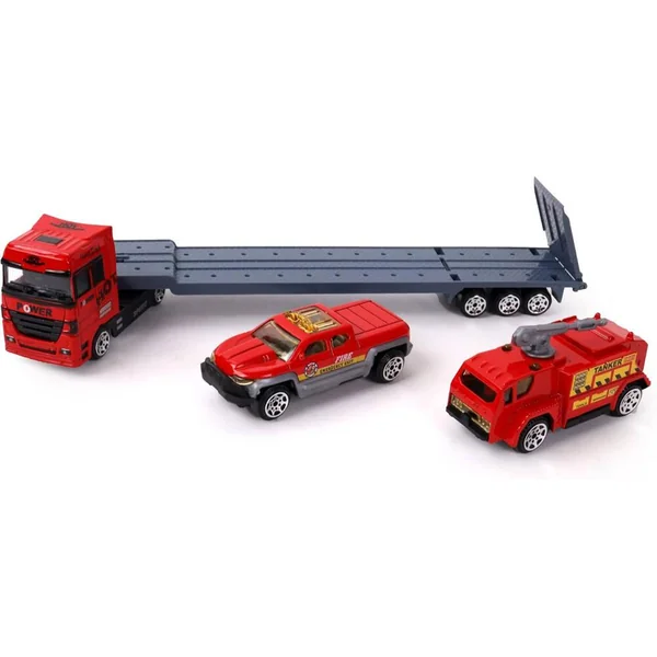 Camion de transport en métal avec roues libres et 2 véhicules d’intervention.