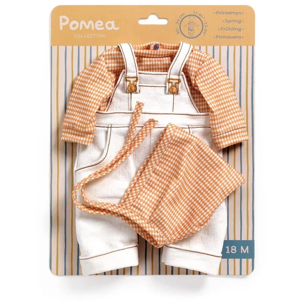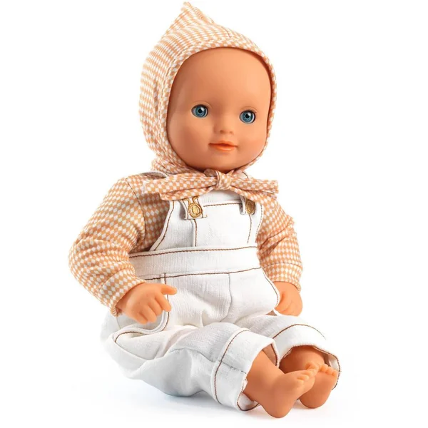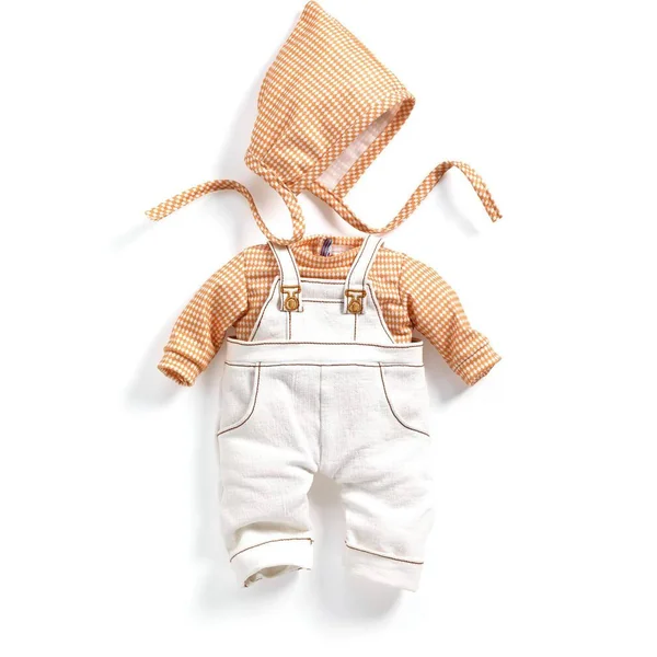 Une tenue chic et décontractée en tissu double gaze 100 % coton. Une salopette ample, qui se ferme grâce aux scratchs dissimulés derrière les attaches, permet aux petits parents d’habiller facilement la poupée. Le béguin complète joliment cette tenue.