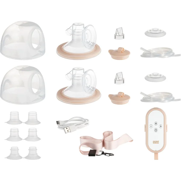 - câble d’alimentation de type C, dispositif de contrôle du tire-lait (corps du tire-lait), membrane en silicone 2 pcs, valve anti-retour 2 pcs, embout de taille 27 mm 2 pcs, réservoir de collecte de lait 2 pcs, couvercle de membrane 2 pcs, tuyau en silicone 2 x 19mm, 2 x 21mm, 2x 24mm), corde de suspension du tire-lait, adaptateur pour bretelle de soutien-gorge 2 pcs.
