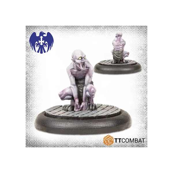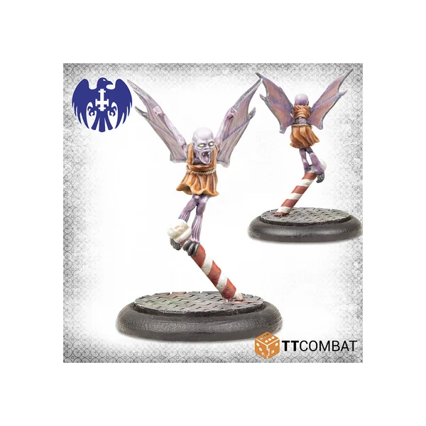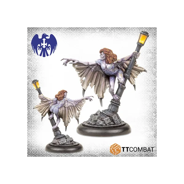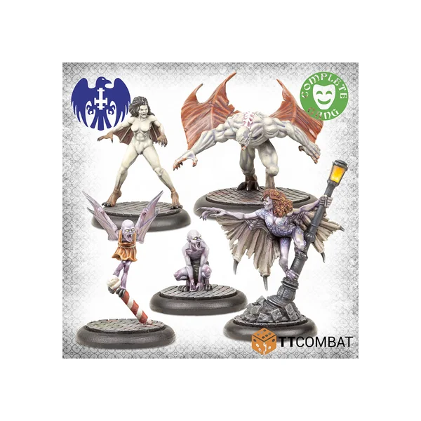 Cette boîte contient un gang de Strigoi complet, un gang venu du ciel ! Une Stryha Crone dirige le groupe, volant dans la ville et se fondant dans son environnement. Deux Harpies sont les plus petites du groupe, des enfants devenus sauvages après avoir reçu le Baiser de Sang. Un Strige est un peu plus sain d’esprit, mais encore plus mortel. Enfin, un monstrueux Strzyga montre ce qui se passe lorsque le cannibalisme va trop loin, révélant la bête qui sommeille en chaque Strigoi.