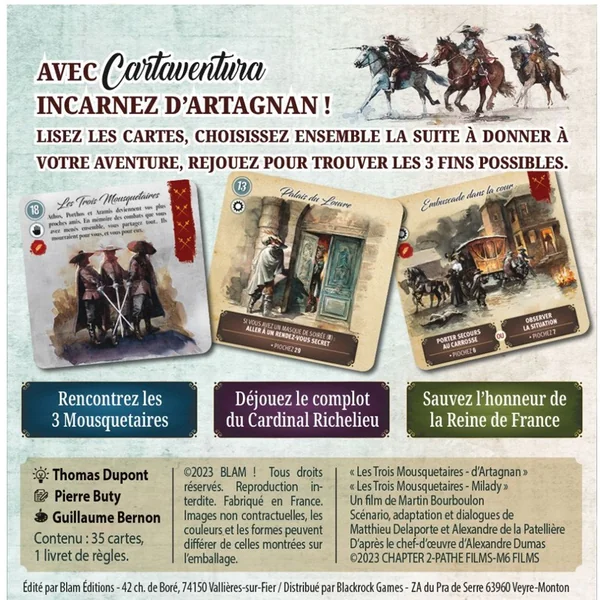Cartaventura Trois Mousquetaires est une collection de mini-aventures dont vous êtes le héros, inspirée par l’univers du film éponyme. À l’aide de cartes qui proposent différentes options, voyagez, explorez et faites les bonnes rencontres afin d’offrir la meilleure fin possible au héros que vous incarnez.