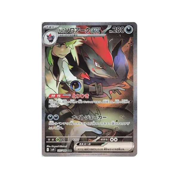 La carte « Chacripan de N » est numérotée 059/100 et fait partie de la série SV9 Battle Partners. Elle a été illustrée par Keisin et sera disponible à partir du 24 janvier 2025. En japonais, elle est nommée チョロネコ (Choroneko) et en anglais, elle porte le nom « N’s Purrloin ». Cette carte est classée comme commune.
