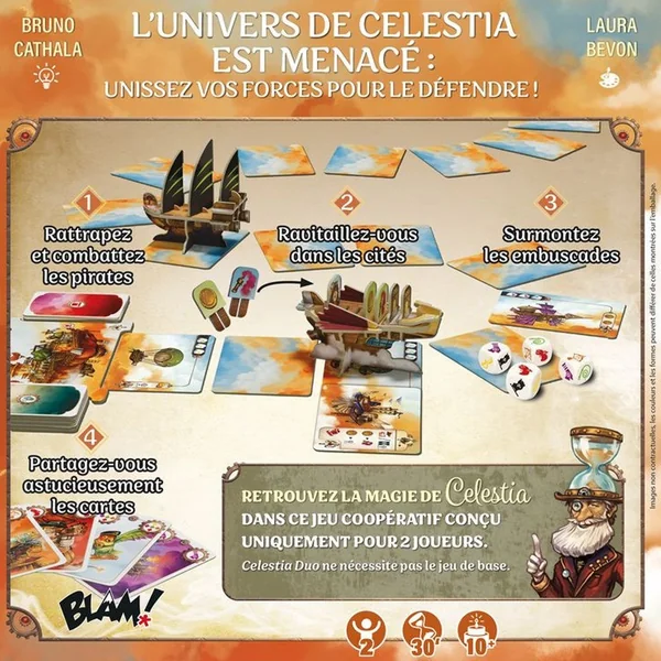 Dans cette version coopérative pour 2 joueurs du jeu Celestia, partez à la poursuite de redoutables pirates à bord de votre aéronef. Communication restreinte, décisions tendues et entraide tactique seront vos seuls atouts pour affronter les dangers qui vous attendent.